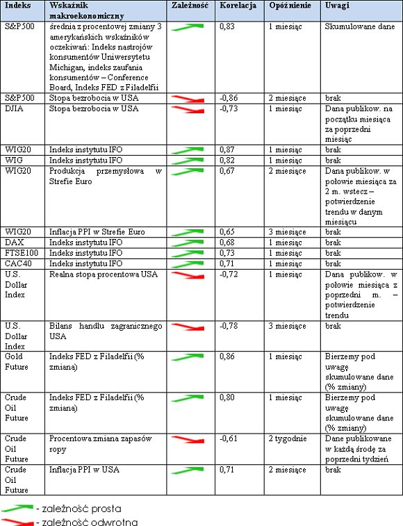 Celem tego materiału jest zbadanie najważniejszych zależności pomiędzy wskaźnikami makroekonomicznymi, a zachowaniem się poszczególnych rynków w horyzoncie średnio- i długoterminowym. Badania empiryczne obejmowały głównie analizowanie korelacji pomiędzy różnymi wskaźnikami a indeksami na danych rynkach. Korelacja jest to zależność występująca pomiędzy dwoma zmiennymi objawiająca się tym, że zmiany zmiennej niezależnej powodują analogiczne zmiany zmiennej zależnej.