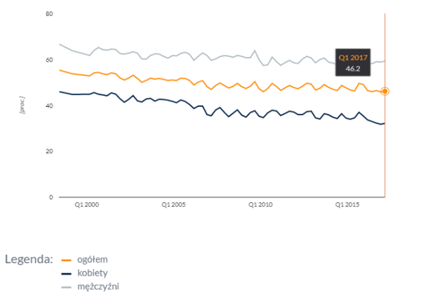 To jest prawdopodobnie najbardziej pozytywne zjawisko na polskim rynku pracy. Rośnie odsetek osób w wieku produkcyjnym (20-64 lata), które pracują lub poszukują pracy. Takich osób jest już prawie 75 procent. Jest to ważniejsze od zmian stopy bezrobocia, ponieważ stopa bezrobocia nie uwzględnia tych, którzy nie chcą lub nie mogą pracować (czyli nie szukają pracy). Na przykład, gdyby połowa ludzi w wieku produkcyjnym nie szukała pracy, a bezrobocie wynosiło 5 procent, wówczas trudno byłoby ocenić taką sytuację jako dobrą. Oznaczałoby to, że pracuje niecała połowa osób zdolnych do pracy, co przy współczesnym welfare state, w którym pracujący płacą za świadczenia społeczne i usługi publiczne dla niepracujących, wywoływałoby ogromną presję na wzrost podatków. Polska ma wciąż niższą aktywność zawodową niż średnia UE, dlatego musimy nadrabiać.