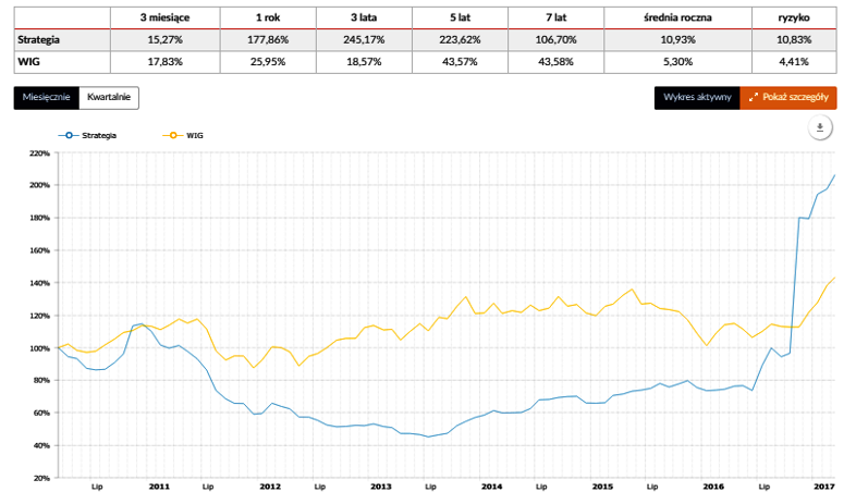 Tutaj jednak jednoznaczność wskazań C/WK się kończy. Przykładowo dla C/WK powyżej 5 siedmioletnia stopa zwrotu wynosi 106,7%. To więcej niż WIG. Warto jednak zauważyć, że taki stan rzeczy to zasługa w dużej mierze jednego dobrego miesiąca. W międzyczasie strata inwestora sięgała nawet 50% kapitału.