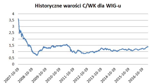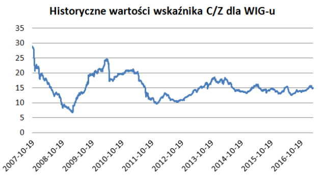 Mimo to można przyjąć, że C/Z mniejsze niż 10 jest raczej atrakcyjne, większe od 20 zaś sugeruje, że spółka może być zbyt droga, jak na zyski, które generuje. Warto choćby spojrzeć na powyższy wykres C/Z dla WIG-u, który pokazuje historyczne wartości tego wskaźnika dla szerokiego rynku GPW. Przez zdecydowaną większość czasu oscylował on w granicach 10-20.
