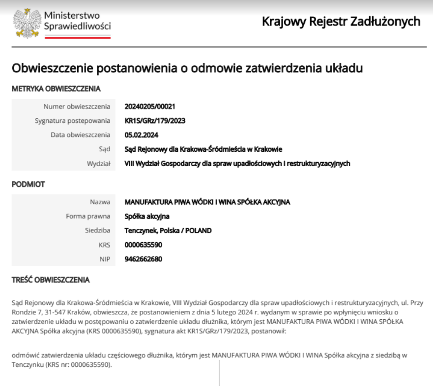 Podczas niejawnego posiedzenia w dniu 5 lutego sąd odmówił zatwierdzenie układu Manufaktury Piwa Wódki i Wina Janusza Palikota z wierzycielami. Tonący w długach alkoholowy holding pokonał kolejny krok dzielący go od bankructwa.