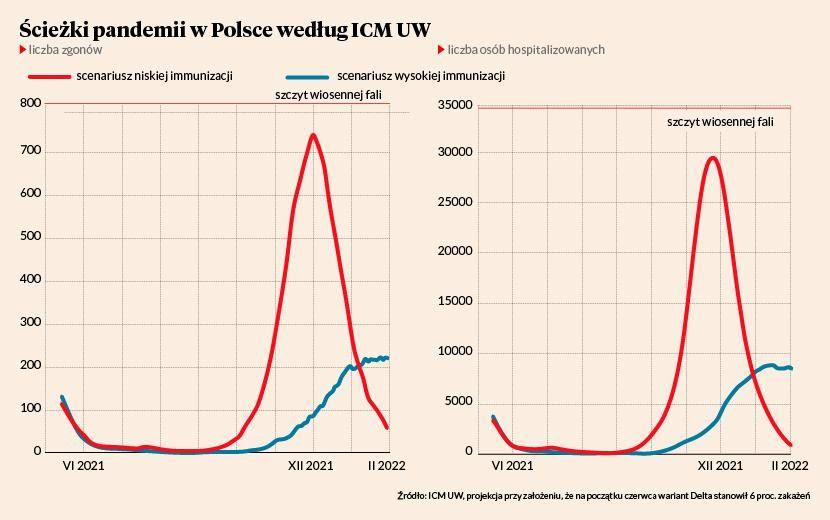 Patrząc na ogromny wpływ drobnych różnic w immunizacji na przebieg fali, trudno nie czuć obaw związanych z niskim stopniem zaszczepienia w Polsce. Odsetek obywateli, którzy otrzymali co najmniej jedną dawkę szczepionki, wynosi 44 proc. (dane OurWorldInData.com). Średnia dla Unii Europejskiej to 50 proc., dla Niemiec – 53 proc., a dla Finlandii prawie 60 proc. O ile na początku roku największym problemem programu szczepień była niska podaż, o tyle teraz jest nim niski popyt. Wiele osób ewidentnie nie chce się szczepić, a rząd nie potrafi znaleźć skutecznych sposobów zachęcania obywateli do szczepień.