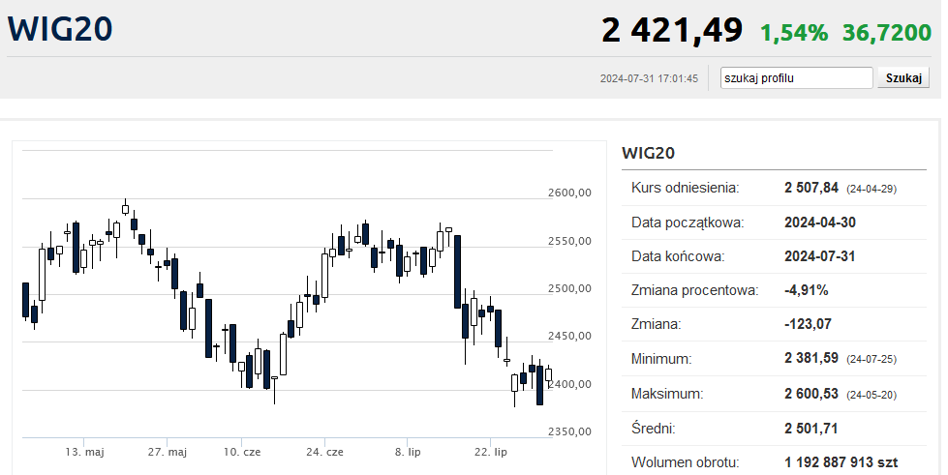 Po kilku dniach giełdowej mizerii warszawska giełda wreszcie wykrzesała z siebie jakieś odbicie. WIG zyskał 1,36% i odbił się od strefy wsparcia wyznaczanej przez czerwcowo-lipcowe minima. Podobnie uczynił WIG20, który w środę poszedł w górę o 1,54% i zakończył sesję na poziomie 2 421,49 pkt. Tym razem wreszcie możemy mówić o w miarę normalnych obrotach, które w środę podsumowano na blisko 1,35 mld zł.