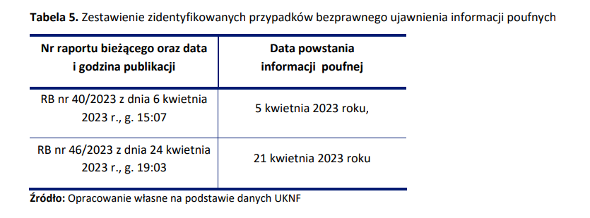 Jednocześnie, raport zasygnalizował, że niezależnie od wątku ewentualnego manipulowania kursem od 23 czerwca br. prowadzone było postępowanie wyjaśniające w zakresie potencjalnego wykorzystania informacji poufnej. To właśnie tego wątku dotyczy wtorkowy komunikat KNF. Zapowiedź raportu dzień wcześniej opublikował na X rzecznik KNF Jacek Barszczewski.