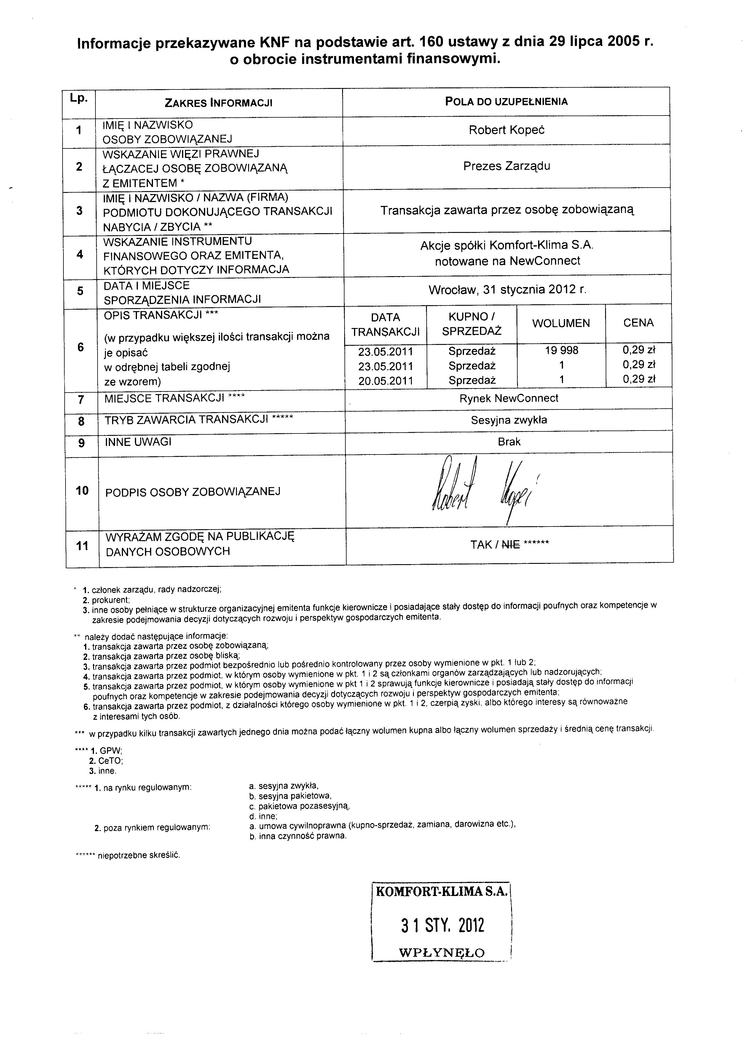 | Zarząd spółki Komfort Klima S.A. ("Emitent" lub "Spółka") informuje, że w dniu 31 stycznia 2012r. powziął informacje o transakcjach zawartych na akcjach Emitenta przez osobe mającą dostęp do informacji poufnych. Wartość przeprowadzonych transakcji nie przekroczyła 5000 euro. Przedmiotowe zawiadomienie stanowi załącznik do niniejszego raportu. |