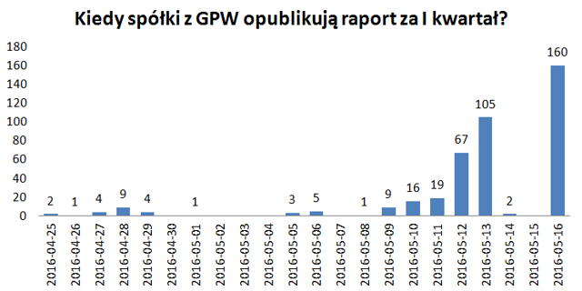 Niestety, opieszałość spółek w tej kwestii jest powszechna. Na przekazanie raportu za I kwartał spółki o standardowym roku obrotowym mają czas do 16 maja 2016 roku. Tego dnia publikację wyników zaanonsowało aż 160 spółek. Sesję wcześniej na rynek trafi 105 raportów. Razem więc, w dwa ostatnie dni robocze wyniki finansowe poznają akcjonariusze ponad 60% przebadanych przez nas spółek. A przecież na publikację raportów spółki mają całe 46 dni!