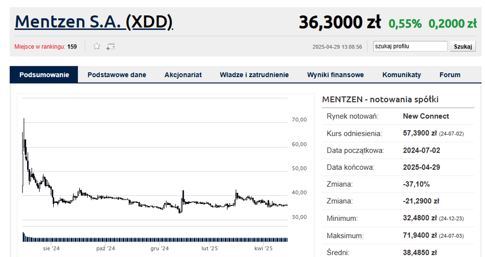 Rok 2025 Mentzen SA zaczął jednak bardzo dobrze, bo w pierwszym kwartale przychody skoczyły o 8,3 proc. rdr do 6,2 mln zł. Z kolei po dwóch kwartałach strat wreszcie spółka zaraportowała zysk na poziomie 1,288 mln zł. To wzrost rok do roku o około 70 proc. i pierwsza taka sytuacja jako spółki publicznej. Co prawa w wynikach za II kwartał 2024 r., czyli już po debiucie, także pokazał zysk netto, ale o 78 proc. niższy rdr.
