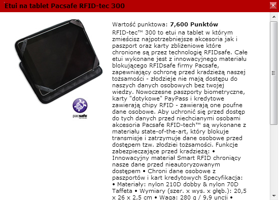 Tymczasem w ramach programu lojalnościowego MasterCard Rewards, organizacja proponuje ciekawy prezent: etui na tablet chroniące przed atakami złodziei tożsamości, "w którym zmieścisz najpotrzebniejsze akcesoria jak i paszport oraz karty zbliżeniowe". Etui można odebrać po zebraniu 7,2 tys. punktów. W opisie etui możemy przeczytać: