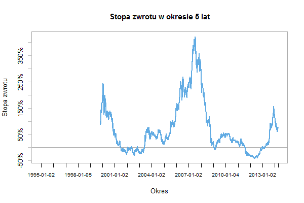 Pod kątem stopy zwrotu wygrywa inwestycja na okres 5 lat, która dała zarobić maksymalnie 403,10%. Największa strata wyniosła 41,18%. Średnia stopa zwrotu wyniosła 75,01% a mediana 43,75%. Pięcioletni horyzont charakteryzuje wyższy VaR niż w przypadku czteroletniej inwestycji – wynosi 26,04%.