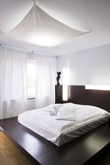 Minimalistycznie urządzoną sypialnią zawładnęły dwa kontrastowe kolory: ciemny, niemalże czarny brąz łóżka i szafy garderobianej, oraz jasne ściany, do których gospodarze dobrali śnieżnobiałej barwy pościel. Biały baldachim sufitowej lampy potwierdza konsekwencję, z jaką zaprojektowano mieszkanie.