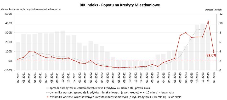 Z danych BIK wynika, że średnia wartość wnioskowanego kredytu mieszkaniowego wyniosła w styczniu 2024 r. 426,88 tys. zł i była wyższa o 23,4 proc. niż w styczniu 2023 r. W porównaniu do grudnia 2023 r. spadła ona jednak o 1,9 proc.