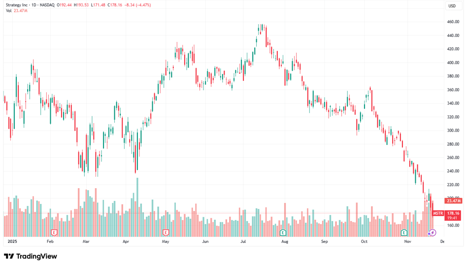 W poważnym kryzysie znajdują się akcje Strategy (dawnego MicroStrategy) czyli największego korporacyjnego posiadacza bitcoinów na świecie. Notowania spółki spadły z najwyższego poziomu w 2025 roku, wynoszącego około 455 dolarów, do wartości poniżej 200 dolarów, wymazując wszystkie dotychczasowe zyski i pozostawiając akcje na spadku o ponad 41% względem początku roku.