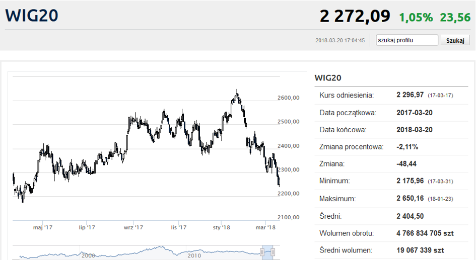 | WIG 20 | Polska | 2272,09 | 1,05 | -3,44 | -5,85 | -0,41 | -7,68 |