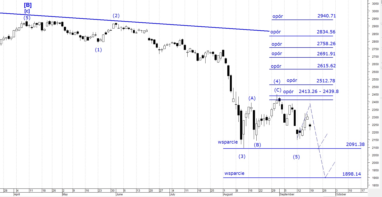 Poniedziałkowe notowania futures na WIG 20 rozpoczęły się od poziomu 2250,0, czyli znacznie poniżej zamknięcia piątkowego, w wyniku czego utworzyła się luka, która może okazać się luką startu rozpoczynającą silny ruch w dół. Bardzo prawdopodobne jest to, że wraz z początkiem tygodnia rozpoczęło się rysowanie ostatniej, piątej (5) fali spadkowej. Początek sesji nie pozostawił wątpliwości kto kontroluje rynek, i która strona jest dominująca. Po silnym poniedziałkowym obsunięciu wynik wtorkowej sesji jest łatwy do przewidzenia. Najbliższe notowania powinny przynieść dalsze zejścia FW20. Nie sądzę aby byki mogły powstrzymać atak niedźwiedzi. Pierwszej próby zatrzymania spadków spodziewałbym się dopiero w okolicy najbliższego wsparcia tj. 2091.38.