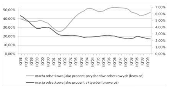 Źródło: „Kształtowanie się marż odsetkowych banków”, Agata Gemzik-Salwach Gdy stopy procentowe rosną, bank otrzymuje więcej pieniędzy od kredytobiorców, ale równocześnie musi więcej zapłacić deponentom. I odwrotnie: gdy stopy maleją, wpływy z tytułu odsetek kredytowych topnieją, ale spadają też koszty utrzymania depozytów. Od dekady marża odsetkowa w polskim sektorze bankowym oscyluje wokół 50% niezależnie od poziomu nominalnych stóp procentowych. Czyli mniej więcej połowa przychodów odsetkowych przekłada się na zysk banków.