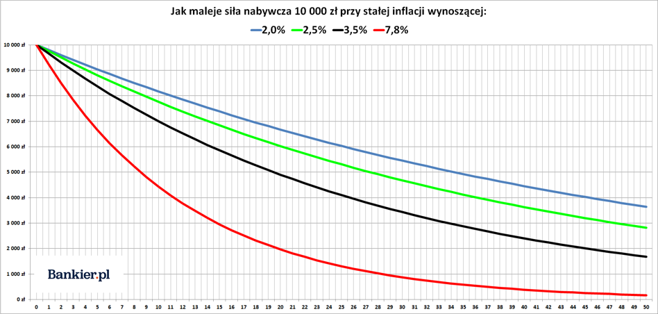 Przy tak wysokiej inflacji CPI siła nabywcza złotego maleje w zastraszającym tempie. Jeśli inflacja utrzyma się na poziomie 7,8%, to złoty straci połowę swej obecnej siły nabywczej w niespełna 9 lat! Tak szybkie tempo utraty wartości pieniądza jest nieakceptowalne dla większości jego posiadaczy.