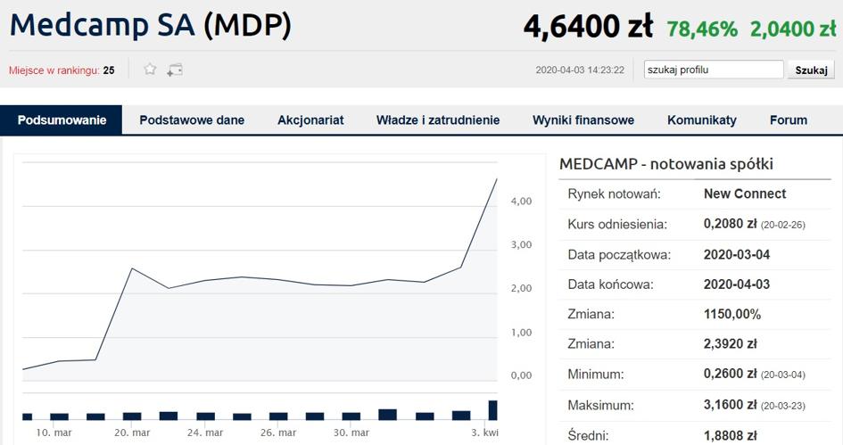 Akcje Medcampu drożeją dziś o ok. 80 proc. przy obrotach przekraczających 15 mln złotych. Tym samym w ciągu zaledwie miesiąca kurs spółki wzrósł już o ponad 1000 proc. Wciąż jest to jednak stosunkowo mała spółka z kapitalizacją nieznacznie powyżej 120 mln złotych.