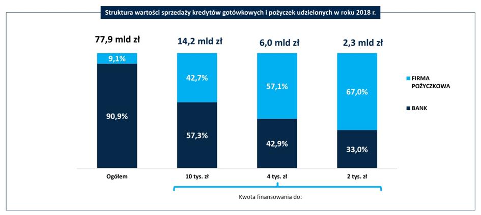 W przypadku kontraktów na kwoty do 4 tys. zł przewagę mają już firmy pożyczkowe. W przedziale pożyczek do 2 tys. zł dominacja niebankowych konkurentów jest bardzo wyraźna. Odpowiadają oni z dwie trzecie udzielonego finansowania.