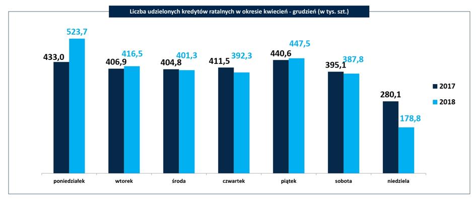 Analitycy biura wzięli pod lupę zmiany zachodzące w popycie na kredyty ratalne. Wprowadzenie zakazu handlu w niektóre niedziele przyniosło interesujący skutek. Zakupy na kredyt „przeniosły się” z niedziel na poniedziałki. Liczba podpisanych umów w pozostałe dni tygodni w okresie od kwietnia do grudnia 2018 r. była zbliżona do wyników z poprzedniego roku. Wyraźny skok jest widoczny natomiast w pierwszym dniu tygodnia – z 433 tys. kontraktów w 2017 r. do 523 tys. w 2018 r.