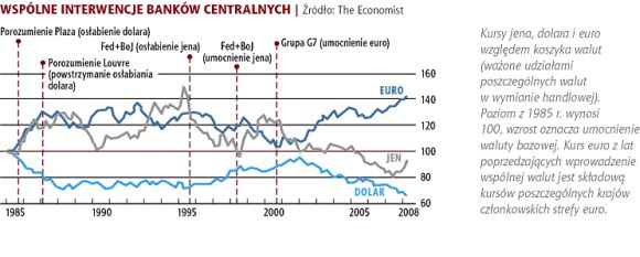 Jak uczy historia (w dużej części przykładów wcale nie zbyt odległa) starcie: pojedynczy bank centralny kontra reszta świata, w większości można by z góry rozstrzygnąć na korzyść rynku. Z drugiej strony liczba skoordynowanych interwencji kilku wielkich banków centralnych jest dość skromna, ponieważ od 1985 r. takie zjawisko obserwowano zaledwie pięć razy: