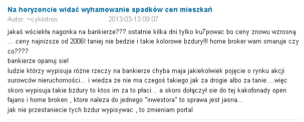 Z kolei użytkownik Real napisał: "Po komentarzach widać, jaki aktualnie panuje "pęd stadny" - widać ze wszyscy są pewni dalszego spadku cen...tak jak to było w 2008, kiedy wszyscy byli pewni wzrostu cen! Ja na szczęscie myslę odwrotnie i wtedy sprzedawałem, a teraz właśnie dałem zadatek na kupno nowego lokum na Mokotowie :) pzdr myślących inaczej!" (pisownia oryginalna)