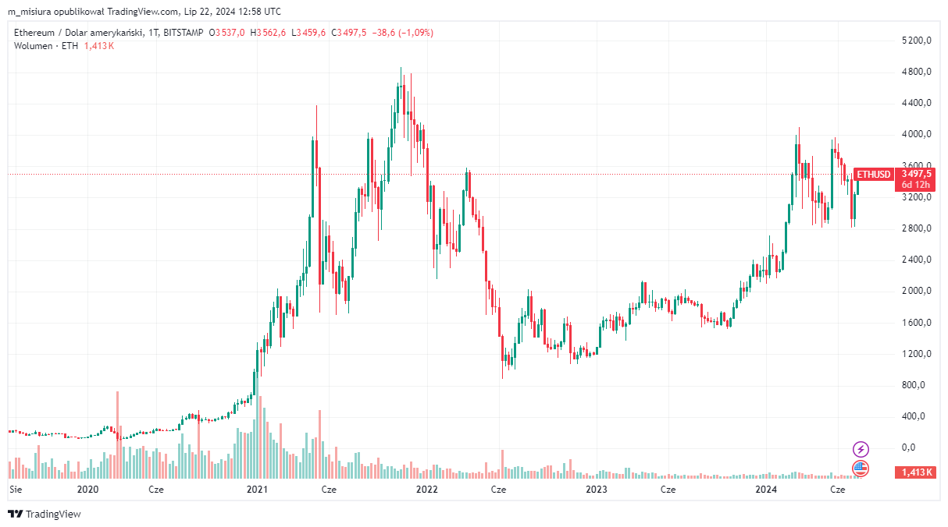 Ethereum, którego kurs wynosił 22 lipca ok. 3500 dolarów, osiągnęło najwyższą historyczną wycenę podczas poprzedniej hossy w listopadzie 2021 roku. Kurs kryptowaluty dotarł wtedy do poziomu 4878 USD. Do pobicia rekordu brakuje mu 39%. Od chwili uruchomienia ETF-ów typu spot na bitcoina do 22 lipca kurs BTC zyskał blisko 45%.