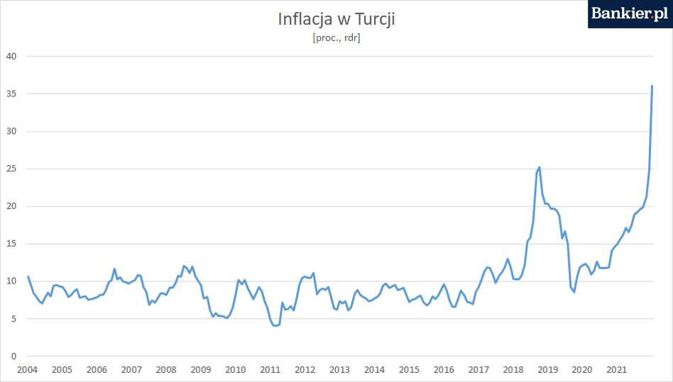 W ostatnim miesiącu 2021 r. inflacja konsumencka w Turcji wyniosła 36,1 proc. Tempo wzrostu cen nie tylko nabrało wyraźnego rozpędu - w listopadzie wskaźnik nieznacznie przekraczał 20 proc. - ale było również zdecydowanie wyższe od oczekiwań analityków spodziewających się wyniku rzędu 30 proc. Tak szybko ceny nie rosły nad Bosforem od blisko 20 lat - pod koniec XX wieku inflacja w Turcji przekraczała nawet 100 proc. W ujęciu miesięcznym wskaźnik przebił w grudniu 13 proc.
