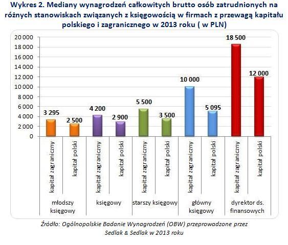 Na różnice w wysokościach wynagrodzeń księgowych wpływało również pochodzenie kapitału przedsiębiorstwa. W rodzimych firmach księgowi zarabiali o 31% mniej niż w firmach zagranicznych. Podobnie starsi księgowi – płace w przedsiębiorstwach polskich i zagranicznych na tym stanowisku różniły się 2 000 PLN. Główni księgowi zatrudnieni w firmach zagranicznych otrzymywali prawie dwukrotnie wyższą pensję od osób na tym stanowisku w polskich przedsiębiorstwach. Równie duże różnice występowały w przypadku dyrektorów ds. finansowych. Na tym stanowisku płace w firmach zagranicznych były o 54% wyższe od płac w firmach rodzimych.