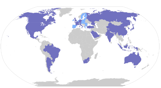 W gronie G-20 znalazło się 20 państw, które łącznie odpowiadają za 85% PKB naszej planety. Podając w kolejności alfabetycznej, w jej skład wchodzą przedstawiciele: Arabii Saudyjskiej, Argentyny, Australii, Brazylii, Chin, Francji, Indii, Indonezji, Japonii, Kanady, Korei Południowej, Meksyku, Niemiec, RPA, Rosji, Stanów Zjednoczonych, Turcji, Unii Europejskiej, Wielkiej Brytanii oraz Włoch.