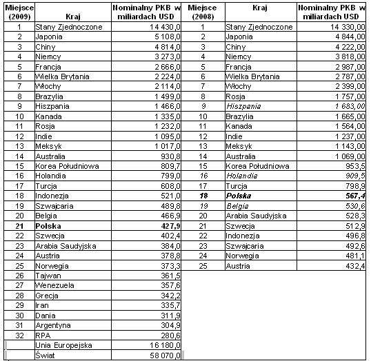 | Miejsce (2009) | Kraj | Nominalny PKB w miliardach USD | Miejsce (2008) | Kraj | Nominalny PKB w miliardach USD |