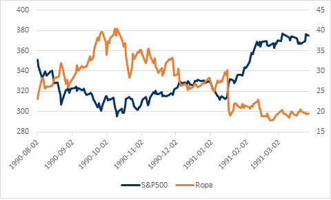 17 stycznia 1991 wojska USA uderzyły z powietrza, co poskutkowało najwyższym od lat skokiem indeksu S&P (3,73%) i jednoczesnym rekordowym spadkiem cen ropy (-31,89%). W trakcie trwania I wojny w Zatoce (do 3 marca 1991) amerykańskie akcje podrożały w sumie o 16,2%, podczas gdy ropa potaniała o 48,7%.