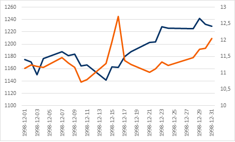 Pod koniec 1998 r. połączone siły amerykańsko-brytyjskie przeprowadziły ponowny atak na Irak, którego celem było zniszczenie fabryk uzbrojenia. Od 16 do 19 grudnia główny indeks Wall Street wzrósł o 3,5%.