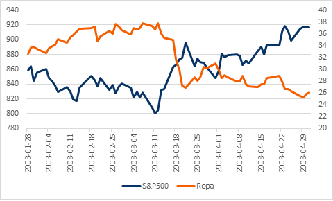 Od 28 stycznia 2003 r., kiedy prezydent George W. Bush zapowiedział możliwość ataku na Irak, do początku marca S&P stracił 7%. Tuż przed samą inwazją indeks ruszył ostro w górę i pierwszą fazę wojny irackiej zakończył zwyżką o ponad 14%. W tym samym czasie ropa potaniała o 30%.