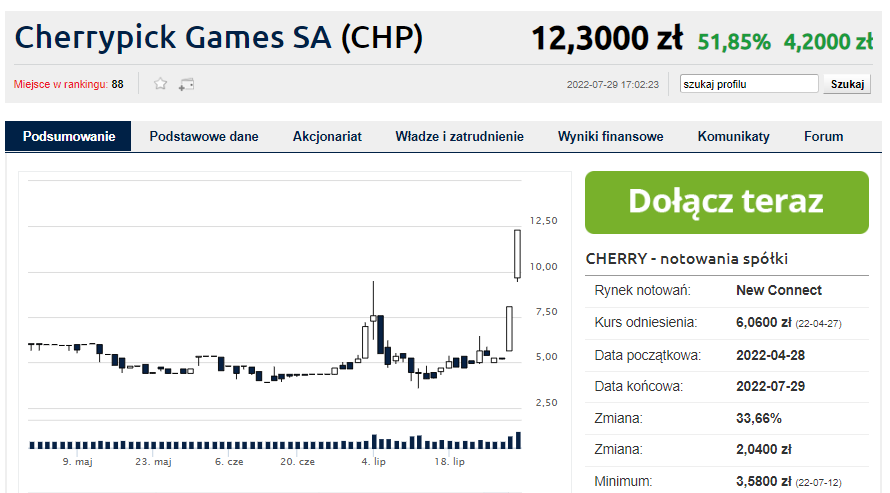 Kurs Cherrypick podobną skalą wzrostów reagował ponad dwa lata temu, kiedy ogłoszono informację o współpracy z amerykańskim Skillz z branży e-sportowej polegającej na przygotowaniu specjalnych wersji gier na ich platformę. Wtedy podano m.in., że Amerykanie zobowiązali się przeznaczyć do 5 mln dolarów na marketing dwóch gier.