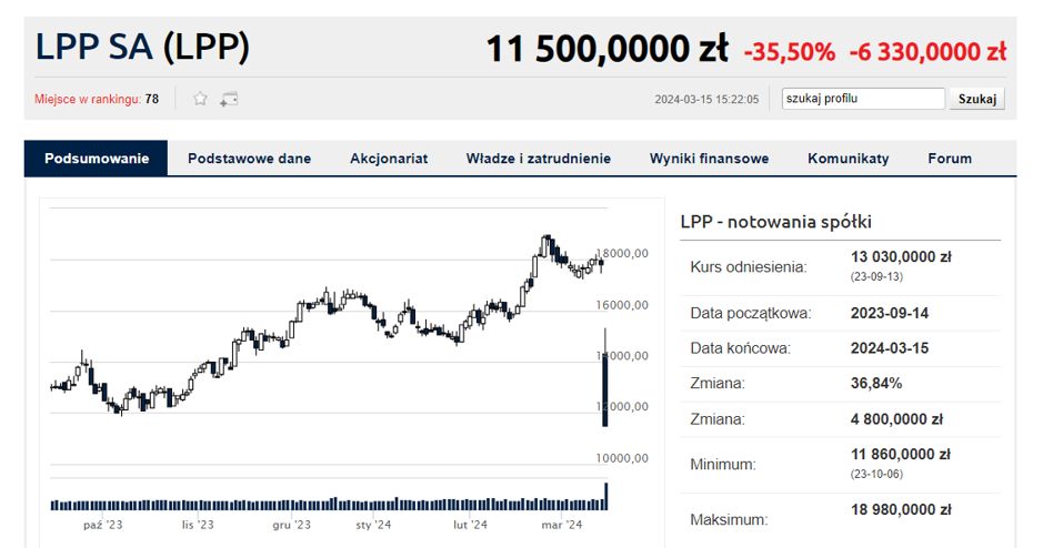 Kurs spółki będącej właścicielem takich marek jak Reserved, Sinsay, Mohito, House i Cropp na starcie sesji giełdowej w piątek 15 marca początkowo się nie otworzył ze względu na jego równoważnie pod naporem ogromnej podaży i zleceń sprzedaży po każdej cenie (PKC). Handel ruszył dopiero po blisko 9 minutach od rozpoczęcia handlu na rynku kasowym i oznaczał przecenę na poziomie 19,9 proc.