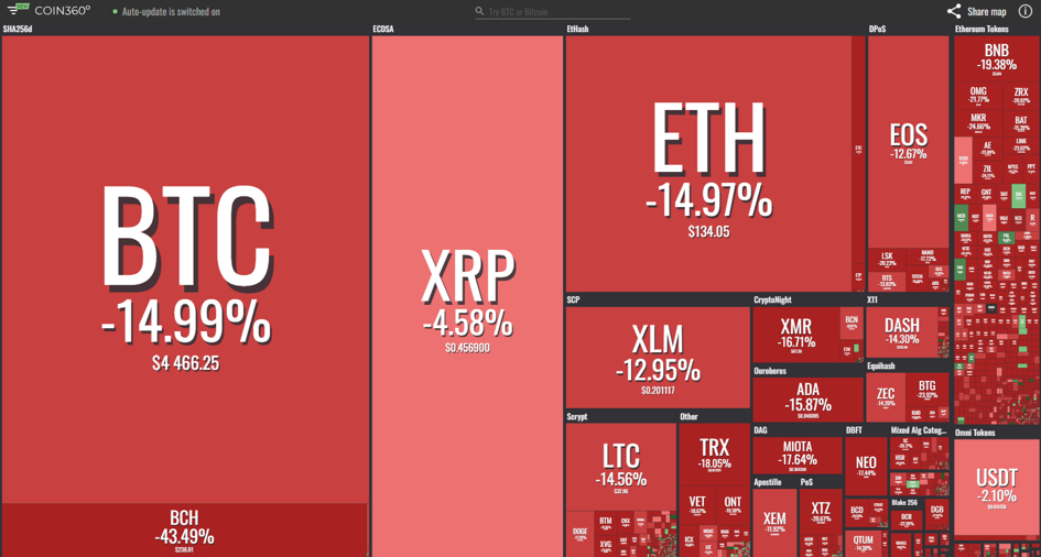 Fala wyprzedaży bitcoina wywołała spadki także na pozostałych kryptowalutach. Spadki te mają różną skalę – przykładowo na ripple sięgają „tylko” 5%, na ethereum oraz litecoinie blisko 15%, natomiast bitcoin cash traci aż 43%.