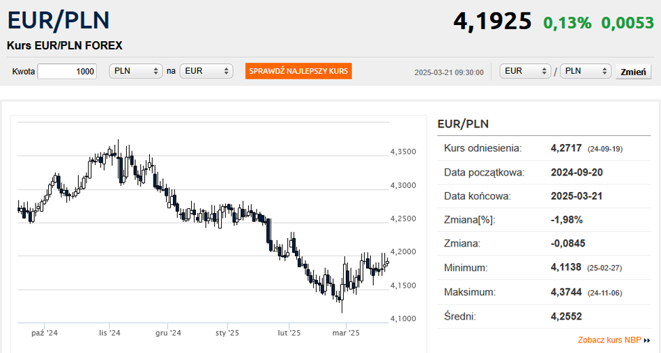 O 9:30 kurs euro kształtował się na poziomie 4,1925 zł i był o pół grosza wyższy od czwartkowego kursu odniesienia. Trzeci dzień z rzędu kurs EUR/PLN usiłuje przebić poziom 4,20 zł, który w ten sposób stał się istotnym oporem technicznym. Zwolennicy analizy wykresów powiedzieliby, że dopóki kurs euro nie przekroczy 4,20 zł, póty nie będzie mowy o ryzyku dalszego osłabienia złotego.