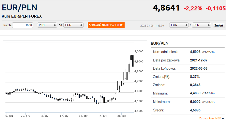 Polski złoty jeszcze nigdy nie był tak słaby. W poniedziałek kurs euro dotarł do granicy 5 zł, której nie osiągnął nigdy wcześniej. Frank szwajcarski praktycznie zrównał się ceną z euro i także kosztował niemal 5 zł. Kurs dolara amerykańskiego przekraczał 4,61 zł i był najwyższy od ponad 21 lat.