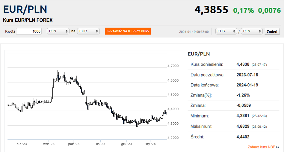 W piątek o 9:37 kurs euro kształtował się na poziomie 4,3855 zł, a więc o trzy czwarte grosza wyższym od wartości z czwartkowego wieczoru. W środę i w czwartek notowania euro chwilowo przekraczały nawet poziom 4,40 zł, osiągając najwyższe wartości od listopada.