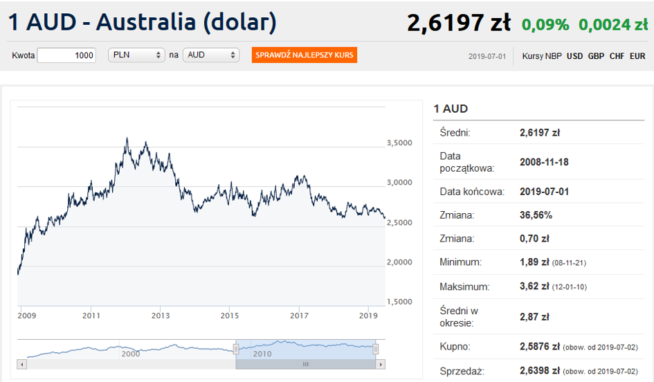 Australijska waluta jest obecnie wyceniana na 2,62 zł. Pod koniec czerwca kurs AUD/PLN zszedł nawet do 2,59 zł, co pomijając jednorazowe „wyskoki” z grudnia 2018 i lipca 2016 było najniższym kursem od 2010 roku.