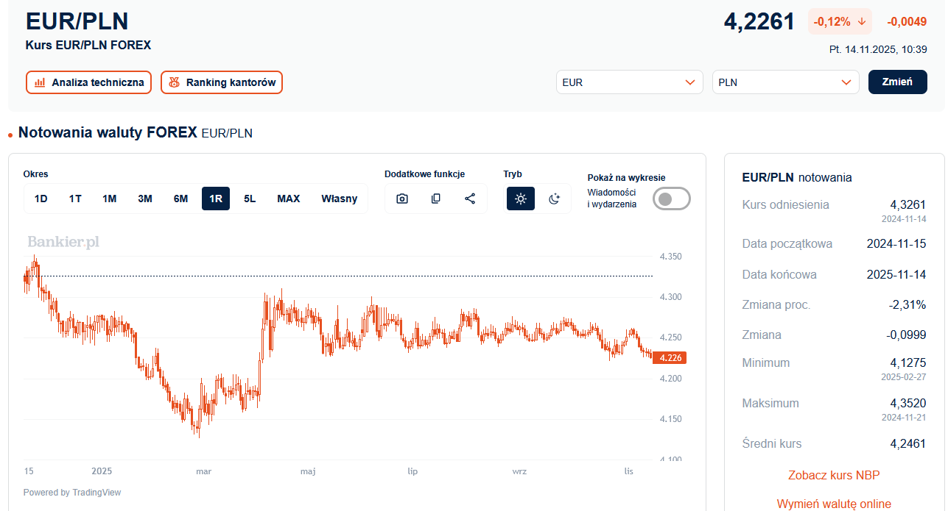 O 10:39 kurs euro wynosił 4,2261 zł, spadając o blisko pół grosza względem poziomu czwartkowego zamknięcia. W ten sposób kurs EUR/PLN testuje linię wsparcia (4,2250 zł) wyznaczającą dolne ograniczenie trwającej od kwietnia konsolidacji.