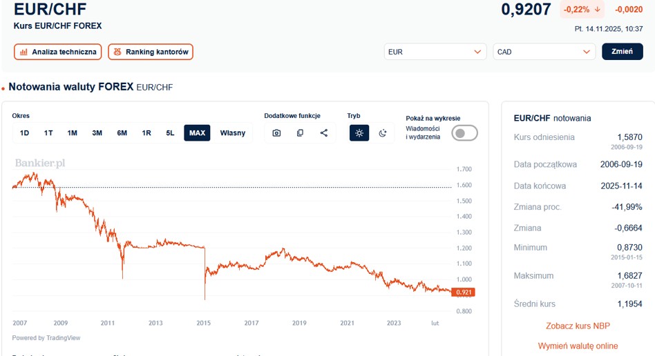 Warto przy tym zwrócić uwagę na siłę franka szwajcarskiego. Kurs EUR/CHF w piątek rano wyznaczył historyczne minimum na poziomie 0,9185, nieznacznie pogłębiając poprzednie historyczne minima z kwietnia i października 2025 roku. W rezultacie pomimo umacniającego się złotego na krajowym rynku frank drożał o blisko grosz, osiągając cenę 4,5895 zł. Nadal jednak kurs CHF/PLN mieści się w obowiązującym od kwietnia trendzie bocznym o zakresie 4,50-4,60 zł.