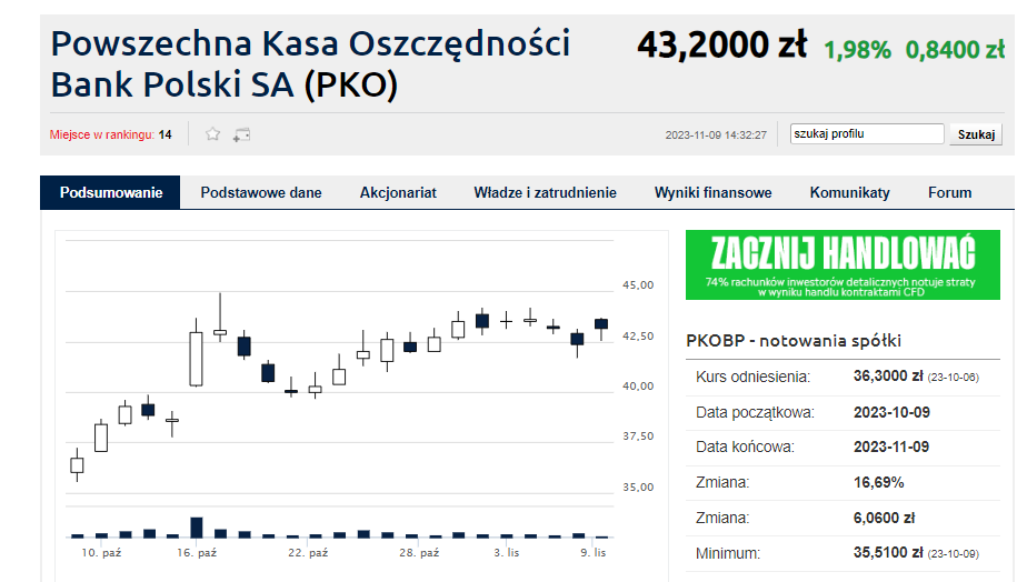 Na konferencji wynikowej inwestorzy dowiedzieli się, że zarząd dąży do wypłaty dywidendy za 2022 r. i ponownie zwrócił się w tej sprawie do KNF-u. W lipcu PKO BP otrzymał w tej sprawie negatywną opinię. Kurs na sesji w czwartek reagował na świetnie wyniki i rósł po godz. 14.30 o blisko 2% Trzeba pamiętać, że od początku października akcje banku podrożały o przeszło 25% do 8 listopada. Na koniec sesji 9 listopada kurs zyskał 3,59 proc.