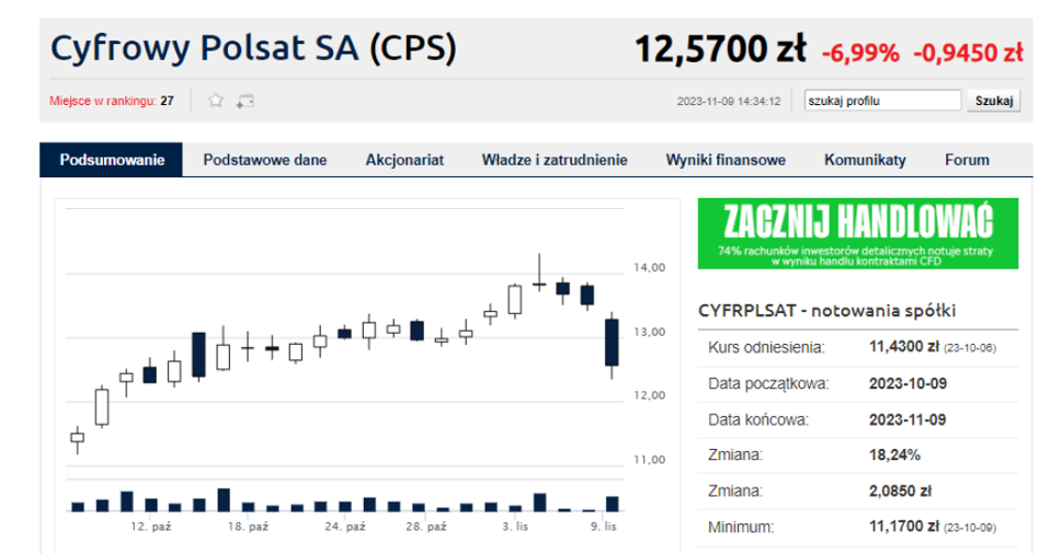W dodatku spółka nie przyniosła dobrych prognoz dla inwestorów w czasie konferencji wynikowej, bowiem spodziewa się niskiego wzrostu rynku reklamy jeszcze do końca 2024 r. Nie zachwyciła także prognoza przyszłorocznego wyniku EBITDA, która w samym segmencie telekomunikacyjnym może odnotować mały, jednocyfrowy spadek, chociaż cała Grupa powinna zatrzymać trend spadkowy. Przymnijmy, że w tym roku spółka stała się także producentem energii ze źródeł odnawialnych po przejęciu kontroli nad spółką PAK Polska Czysta Energia. Kurs Cyfrowego Polsatu zareagował mocną przeceną i spadał o ponad 7 proc. drugiej części sesji. Na koniec sesji przecena sięgneła 9,21 proc.