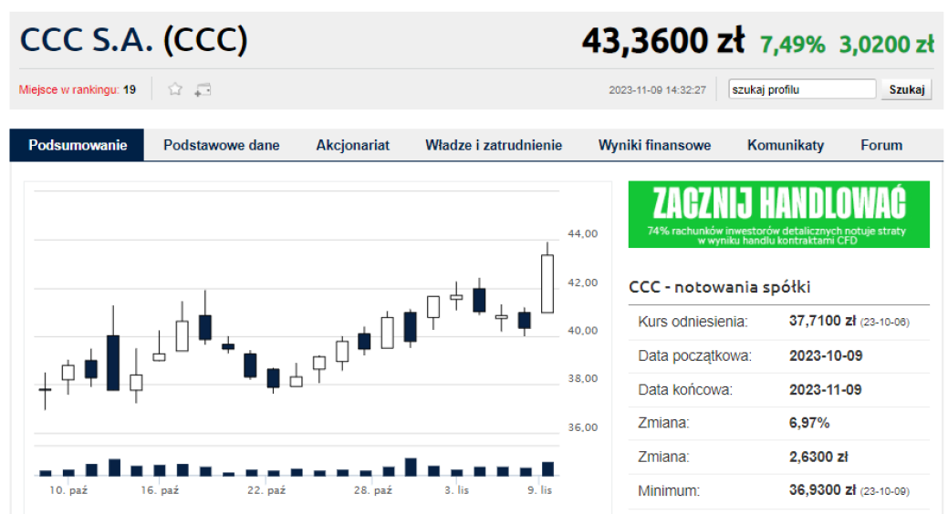 Inwestorzy z na konferencji wynikowej przekonali się o motywacji władz spółki to optymalizacji kosztowej, dla której widzą jeszcze duży potencjał do ich ograniczania. Wskazano też, że poprawa wyników jest kluczowa w staraniach o refinansowanie obecnego zadłużenia. „Na bazie tych wyników doprowadziliśmy do istotnego polepszenia wszystkich wskaźników bankowych, a od nowego roku będziemy mieli istotnie niższy koszt finansowania" – zapowiedziano. Kurs notowanego w mWIG40 CCC zyskiwał przeszło 7,6 proc. Na koniec handlu cena akcji wzrosła o 10,29 proc.