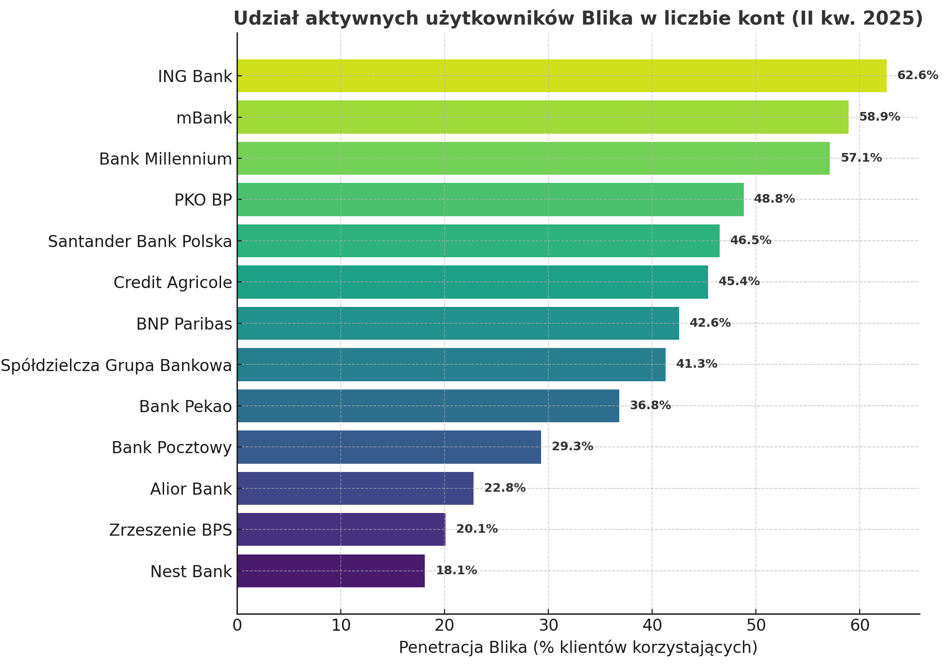 Najwyższe wskaźniki „blikizacji” bazy klientów widać w bankach, które od lat konsekwentnie rozwijają rozwiązania mobilne. ING Bank ma 2,51 mln aktywnych użytkowników przy 4,00 mln kont, co daje aż 63% klientów aktywnych w Bliku. mBank notuje 2,65 mln użytkowników na 4,50 mln kont (59%), a Bank Millennium – 2,13 mln na 3,73 mln kont (57%).