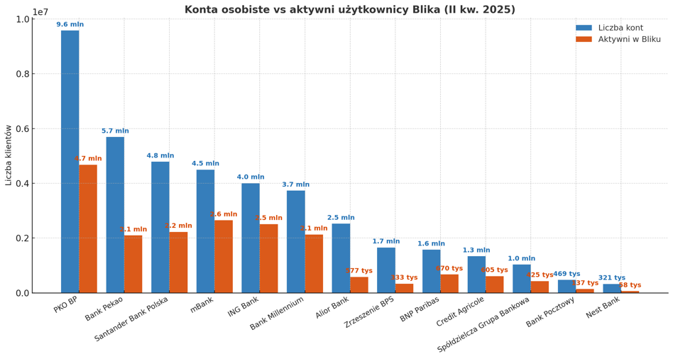 Na marginesie warto dodać, że Citi Handlowy i BOŚ nie przekazały danych o aktywnych użytkownikach Blika, więc nie są ujęte w porównaniach. Z kolei niewielkie rozbieżności pomiędzy sumą bankowych danych (19,1 mln) a informacją operatora (19,4 mln) wynikają z różnic metodologicznych i nieregularności w raportowaniu. Ogólny obraz jest jednak jasny: w Polsce około połowy posiadaczy kont aktywnie „blikuje”, a w kilku bankach już niemal dwóch na trzech klientów.