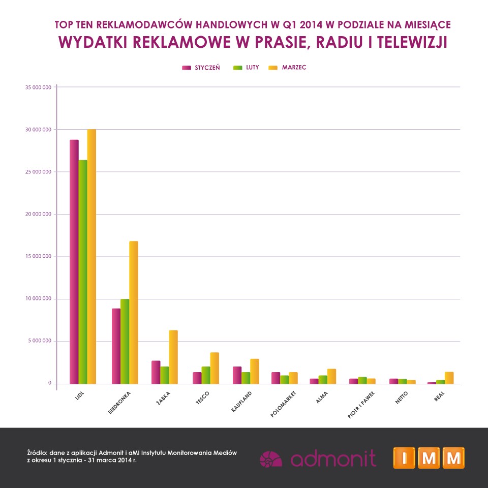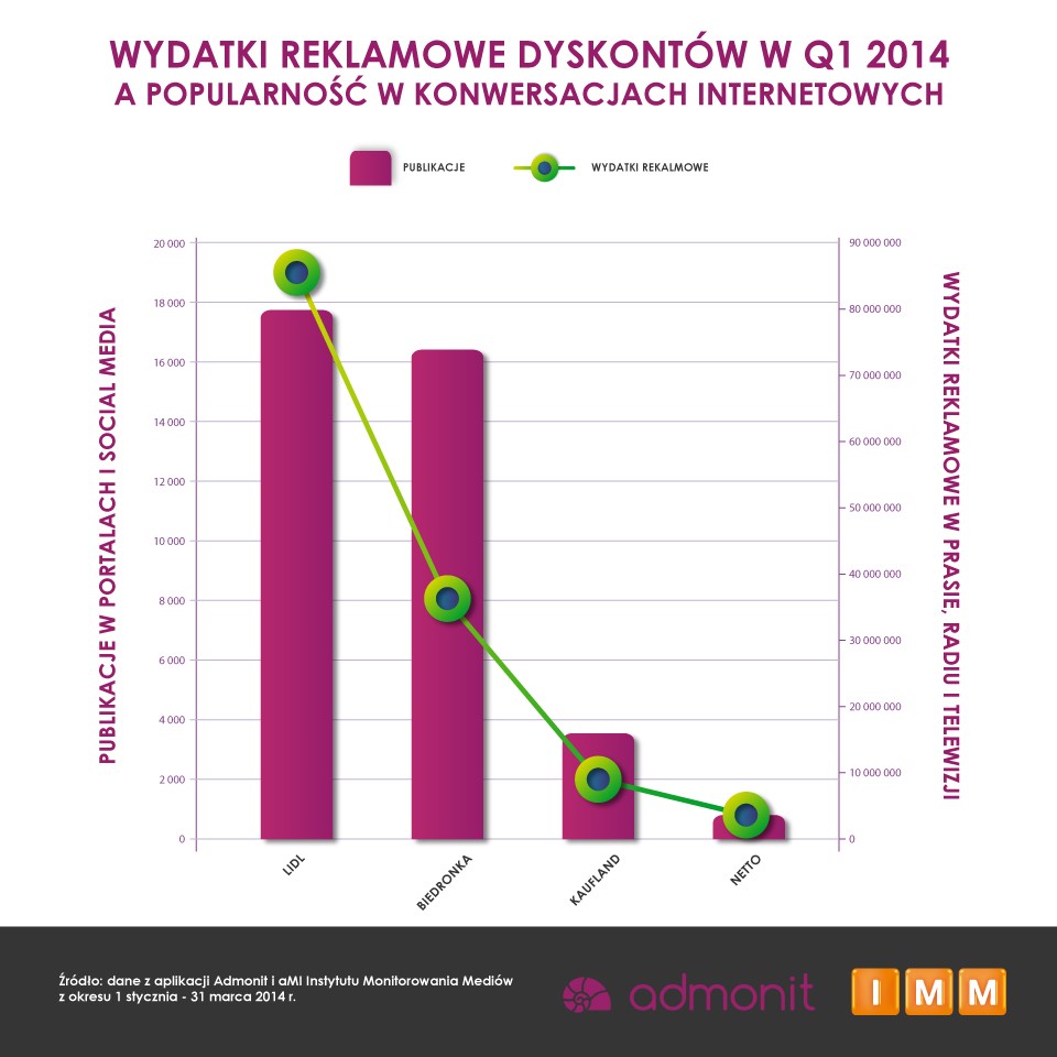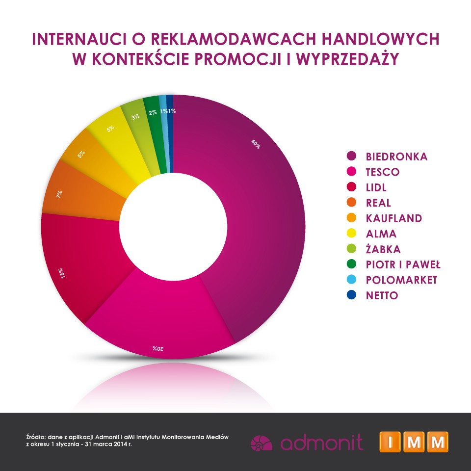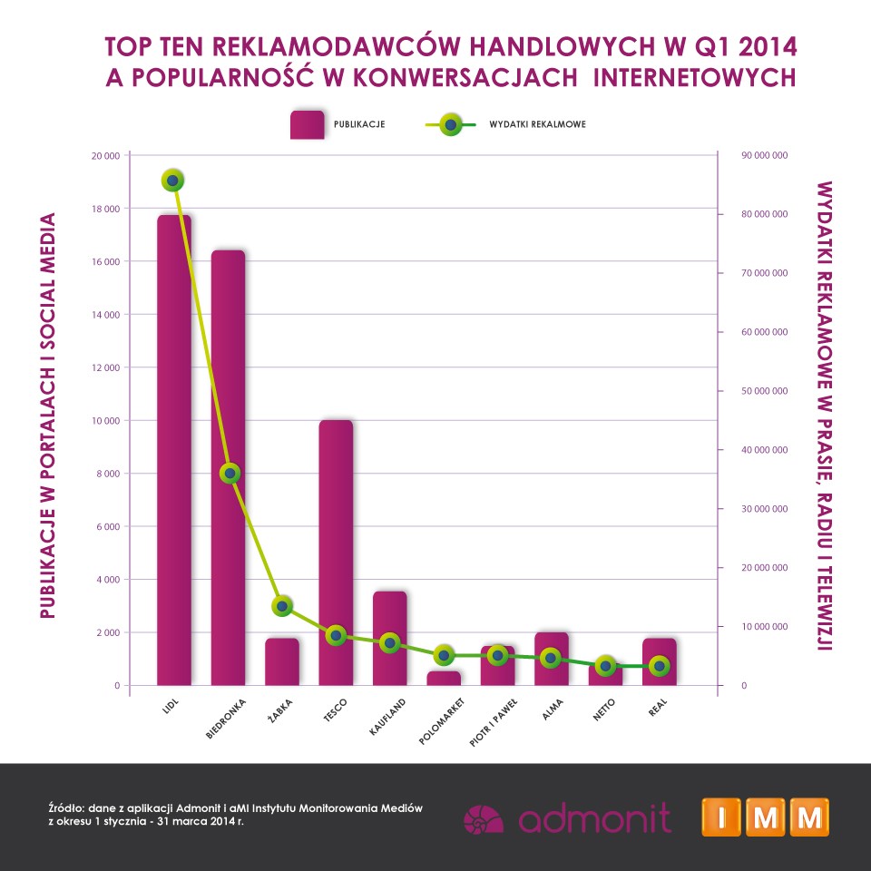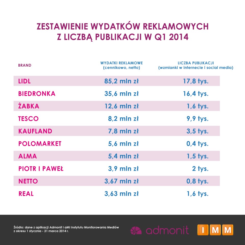 Instytut Monitorowania Mediów zbadał wydatki reklamowe hipermarketów, supermarketów, dyskontów i sklepów convenience w I kwartale br. przy użyciu aplikacji Admonit. Analizie poddano reklamy w prasie, radiu i telewizji, a także ich oddźwięk w sieci. Zbadano ponad 56 tysięcy ogólnodostępnych wzmianek w internecie wraz z mediami społecznościowymi, w których pojawiały się nazwy sieci handlowych w kontekście niekomercyjnym.