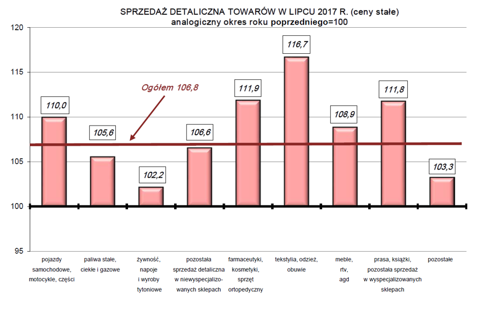 Wzrost w cenach stałych wyniósł zaś w lipcu 6,8 proc. rok do roku i 1,2 proc. miesiąc do miesiąca. Wzrosty zanotowano we wszystkich kategoriach. Najmocniej, o 16,7 proc. wzrosła rok do roku sprzedaż w kategorii "Tekstylia, odzież, obuwie". Dwucyfrową dynamikę zanotowały także farmaceutyki, prasa i książki oraz pojazdy samochodowe. Najsłabiej, o 2,2 proc., wzrosła sprzedaż w kategorii "Żywność, napoje i wyroby tytoniowe". Warto tutaj zauważyć, że z danych o inflacji CPI wynika, że wkategorii tej odnotowano w lipcu także największe wzrosty cen (rok do roku).