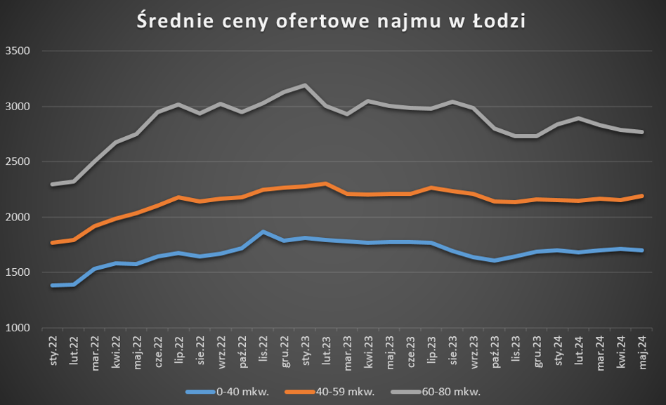 Podczas gdy w ujęciu trzyletnim (względem maja 2021 r.) mieszkania na wynajem w Krakowie „podrożały” w ogłoszeniach średnio o 59 – 66 proc., w Warszawie przeciętnie o 48 – 52 proc., a we Wrocławiu o 40 – 45 proc., w Łodzi średnie ceny ofertowe w analizowanym okresie wzrosły odpowiednio o 21 proc. (60-80 mkw.), 28 proc. (40-59 mkw.) oraz 34 proc. (0-40 mkw.).